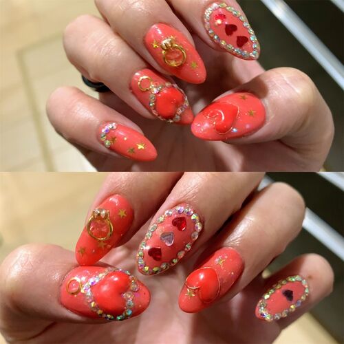 長さも短くして今回はゴテゴテにしてもらいました👍 前回長すぎて扱いにくかったので短めにしたけどやっぱり このくらいの長さが一番手先も使いやすいような気がする。 ベースの色もう少し薄ピンクにすれば良かったかな・・・